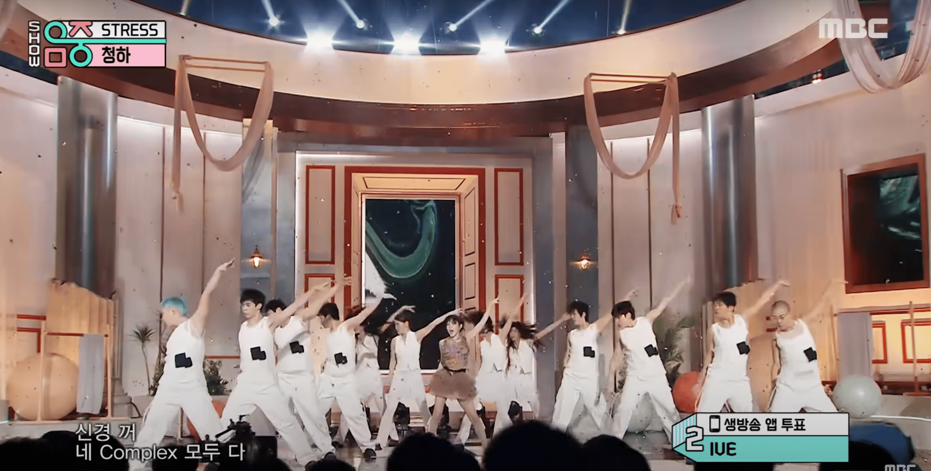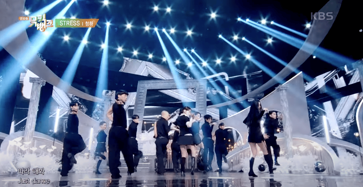 다음으로는, 뮤직뱅크다. 배경 같은 구조의 세트 디자인, 가수가 드러나지 않고 팀 청하의 코레오 무대를 보는 듯한 느낌이다. 근데, 그것대로 나쁘진 않음.