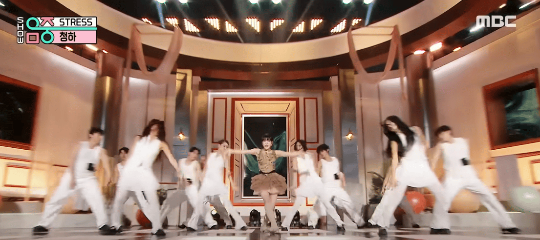 다른 무대를 보면, 어떤 점이 달랐는지 알 수 있다. 먼저, 컴백 무대였던 엠카운트다운 무대. 신나게 스트레스를 날려버리는 뉘앙스의 화려한 무대 연출, 청하는 댄서들과 함께 화이트와 블랙으로 꾸몄다. 컴백 무대이니 만큼 볼거리 많고 좋은데, 그만큼 청하가 잘 보이진 않는다.